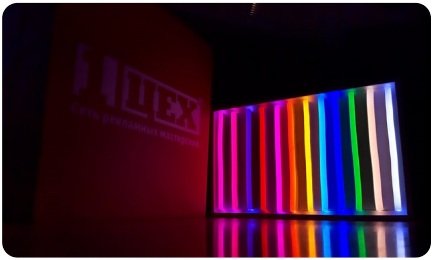 Используя rgb-диоды мы изготовим для вас вывеску, свечение и цвет которой настраивается через контроллер самостоятельно пульта. При сдаче заказа наш технолог программирует вывеску на выбранную динамику, а в дальнейшем вы сможете делать это самостоятельно.