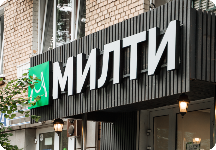 А вот магазины готового питания Милти дополнили название графическим элементом в виде вилки и ножа.