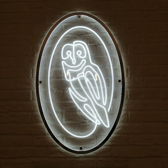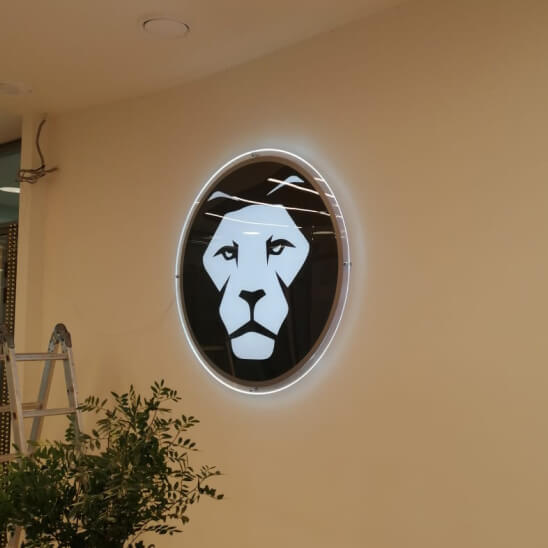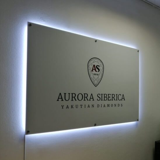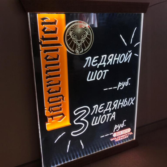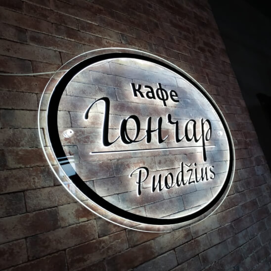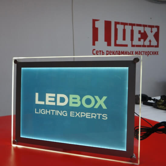 Изготавливается из акрилового оргстекла. Контуры изображения (логотип или текст) наносятся методом гравировки, цветовой наполнитель - немецкая пленка Oracal. Торцевая подсветка создает эффект свечения выгравированного контура.